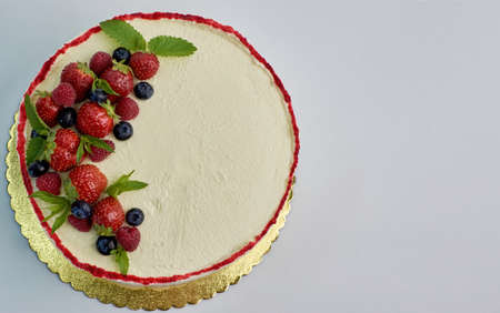 Homemade tasty biscuit cake with mascarpone cheese decorated berries, mint, strawberries and blueberries in hand. Vertical format. Birthday.