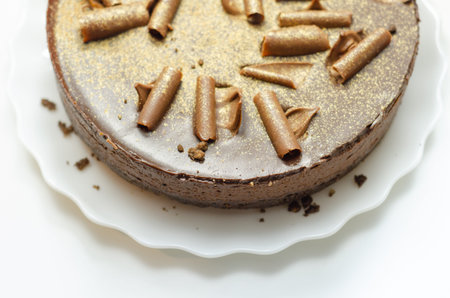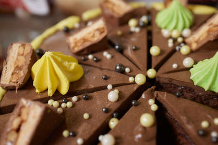 Chocolate cake for men with chocolate decorations and the streaks of chocolate.