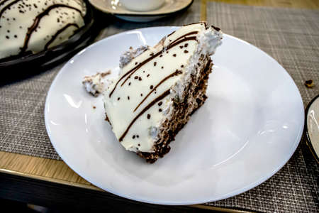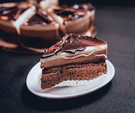 Slice of delicious chocolate cake. Piece of Cake on a white Plate. Sweet food. Sweet dessert. Close up. Selective focus.
