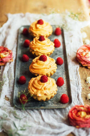 Fruit dessert tartlets with vanilla custard and fresh raspberries, blackberry and peach served on wooden tray with baking forms, kitchenware on the old wooden table. Dark rustic style.