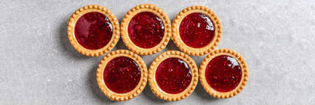 Tasty tartlets with jam on light gray table, flat lay. banner design