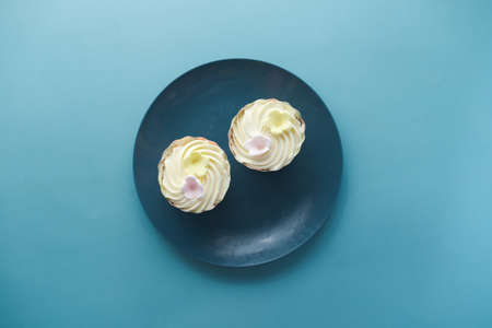 Delicious tartlet cakes or basket cake biscuit with fresh strawberry and whipped sour cream on beautiful cake board on blue background, top view. vegetarian sweet dessert food