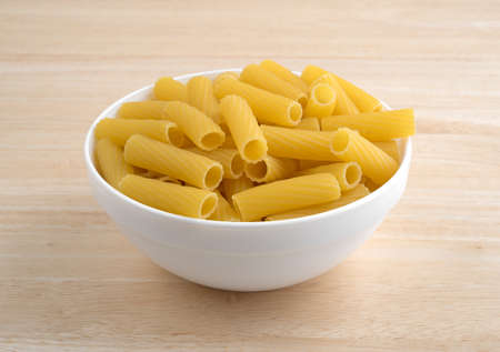 A small white bowl filled with rigatoni pasta on a wood table top.