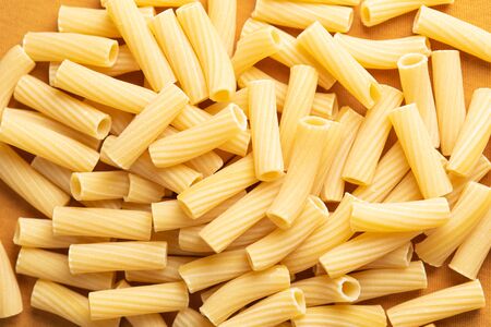 Detail of a pile of rigatoni pasta with soft light and orange background.