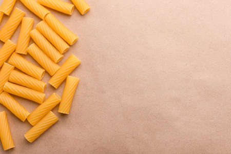 Rigatoni pasta or tube shaped pasta over wooden background