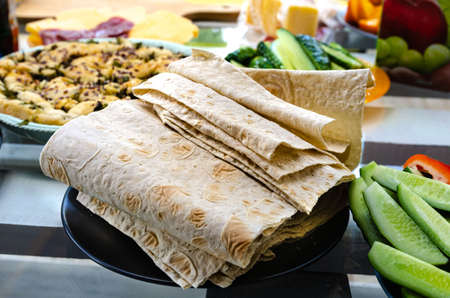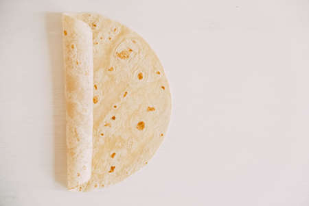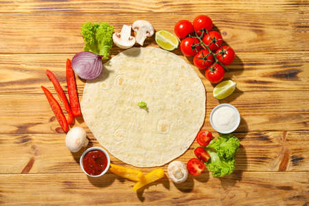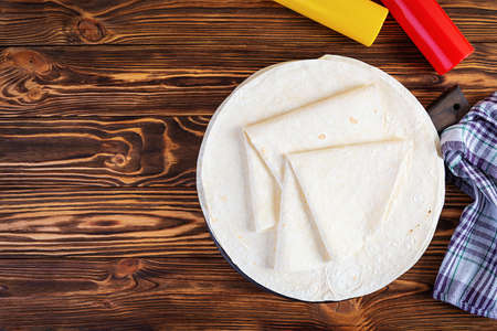 Flour Tortilla Wraps Homemade wheat tortillas, pita bread, tortilla, pita with ingredients for cooking on table. Top view. The concept of homemade food.