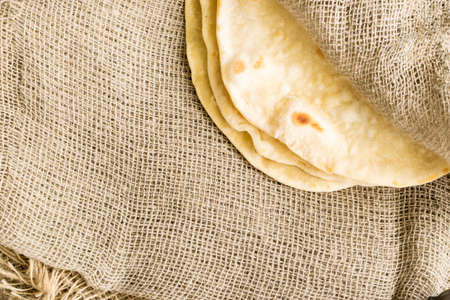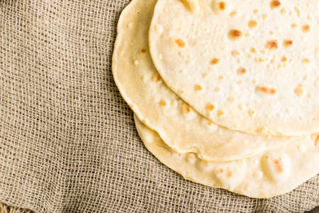 Plain Wheaten Flat Bread on a Burlap Background Top View. Fresh Homemade Flatbread also known as Pita Bread, Chapati, Naan or Tortilla