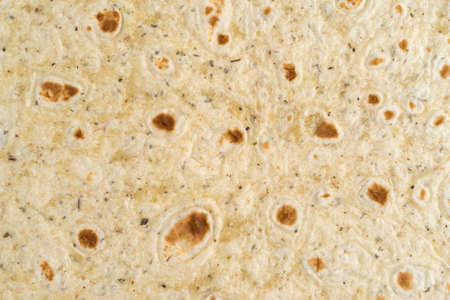 A very close view of a tortilla wrap with garlic and herb flavoring.