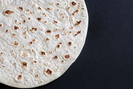 Grilled tortilla. Mexican flatbread - tortilla on a black concrete background with flour.