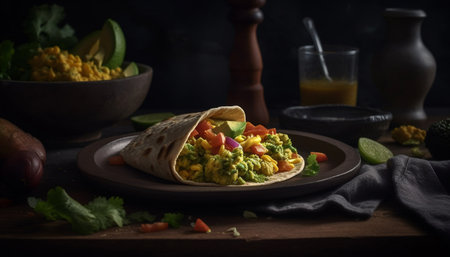 Delicious breakfast burrito filled with eggs, tomatoes, and spices served with salsa