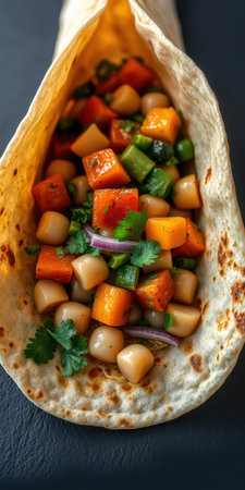 Colorful vegetable wrap with chickpeas and fresh herbs served in a tortilla
