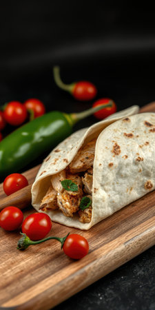 Freshly made chicken wrap with cherry tomatoes and jalapenos on a wooden board