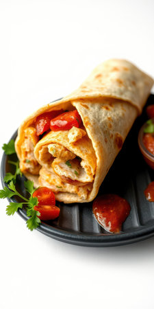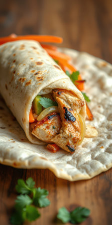 A vibrant wrap featuring grilled chicken and fresh vegetables, perfect for a healthy meal. Ideal for lunch or dinner with a burst of flavors.