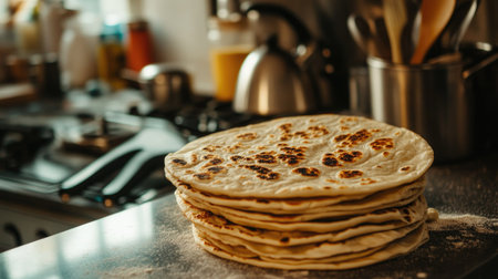 Detailed view of a stack of rotis with a focus on their texture and warmth, placed on a clean kitchen counter with cooking utensils