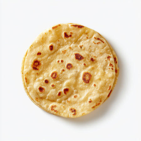 A single flour tortilla with a golden-brown spot, laid flat on a white background, highlighting its authentic cooking marks.