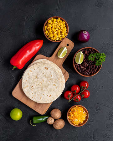 Preparing to cook vegetarian tacos with mushrooms, beans, peppers, corn, and cheese. Traditional mexican food, top view.