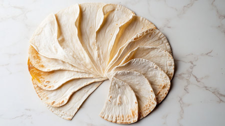 Top-down view of multiple flour tortillas stacked in a perfect circle on a white surface, illustrating their consistent craftsmanship.