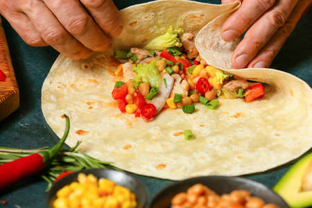 Man preparing tasty burrito with meat on table, closeup