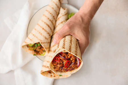 Man holding tasty burrito on light background