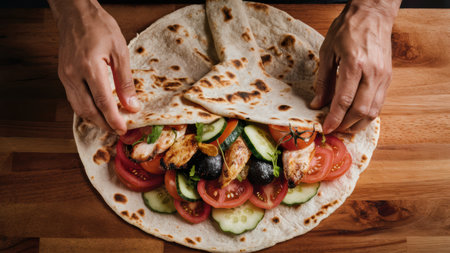 A person holding a tortilla with vegetables and meat inside, AI