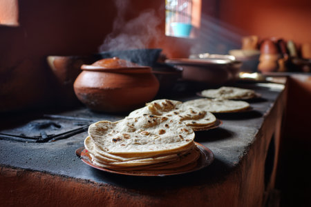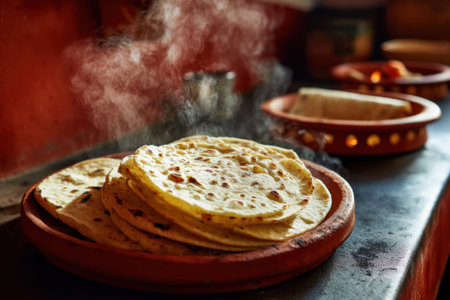 This image depicts a stack of freshly cooked flatbreads resting on a wooden surface, with steam gently rising, highlighting the essence of traditional culinary skills and inviting warmth.