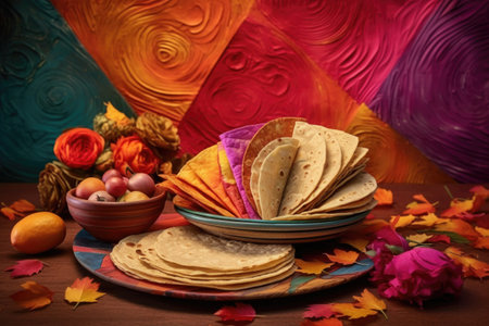 artistic arrangement of tortillas on colorful plate, created with generative ai