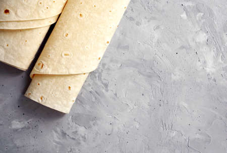 Tortillas, flat breads on grey textile background. Copy space. Top view.