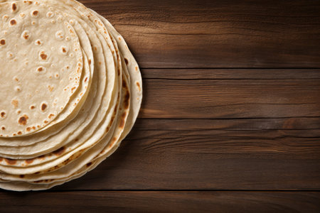 top view of stacked tortillas on the wooden table background with copy space