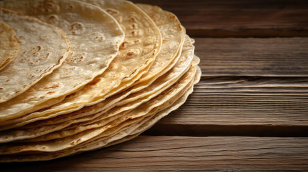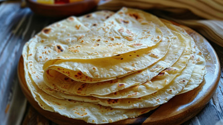 A close-up image of a stack of freshly made tortillas, their edges slightly browned and glistening with a light sheen. They are arranged neatly on a wooden platter, their warm aroma hinting at a delicious meal to come.