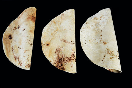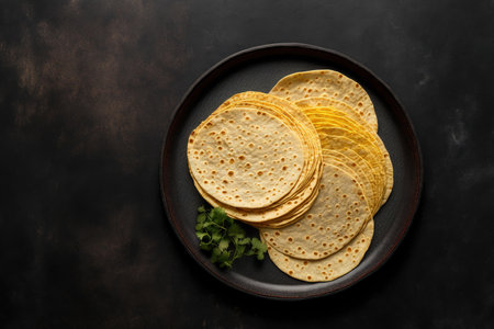 Corn tortillas on black background. Unleavened bread. Mexican tortillas