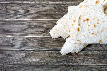 Armenian flat bread lavash. Thin pita bread on wooden background. Top view. Copy space.