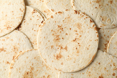 Many tasty homemade tortillas as background, top view