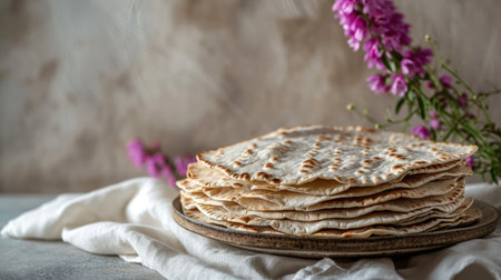 AI Generated. Stacked lavash bread on floured surface with warm light