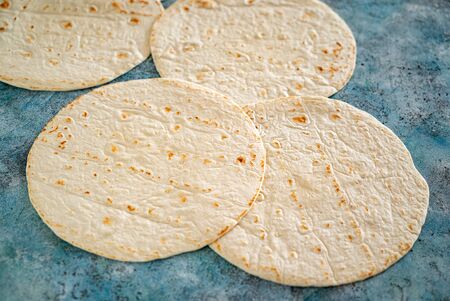 Homemade Wheat Flour Tortillas in a Stack, top view. Flat lay, overhead, from above. copyspace.