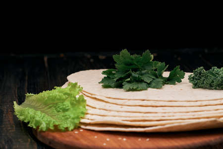 Top view of homemade round tortillas stack on black table background. Tortilla, pita or lavash made of wheat flour, ingredient for cooking burritos, tacos, quesadilla, sandwich wrap