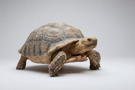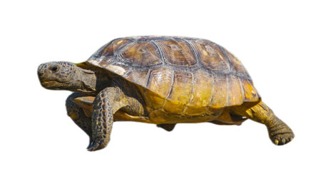 desert tortoise with a distinct domed shell is slowly advancing showcased against a bright clean white backdrop. The focus emphasizes its unique textures and patterns.