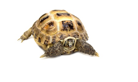 A large brown and black turtle is standing on a white background. The turtle has a yellow spot on its face and a brown and black shell