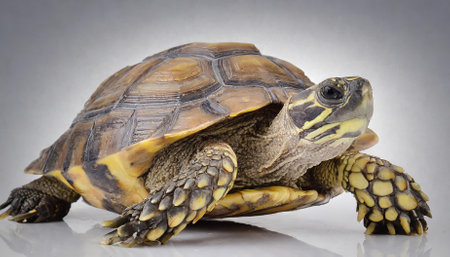 A stunning close-up of a yellow and black turtle gracefully crawling on a soft gray surface, showcasing intricate shell patterns and serene wildlife beauty.