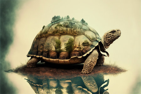 Contemporary abstract artwork double exposure turtle of and forest landscape design, concept of aimal and natural wilderness adventure. Superb Generative AI.