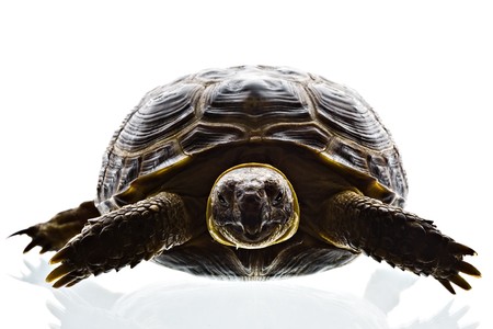 A turtle moves slowly across a white surface, highlighting the details of its shell and legs.