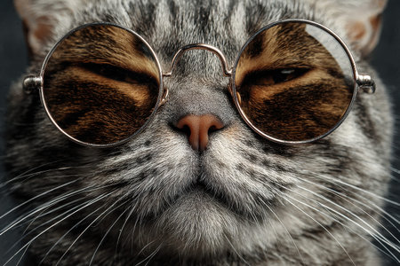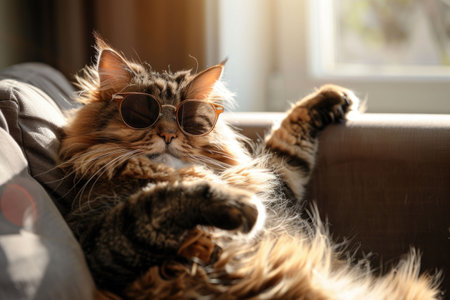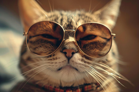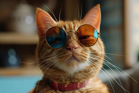 Funny cat portrait wearing stylish sunglasses, capturing a charming expression and playful demeanor, highlighting its unique personality with a backdrop that enhances its features