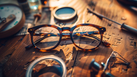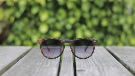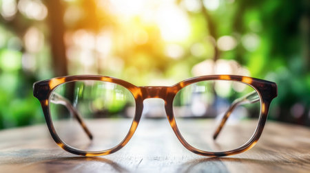 A pair of stylish vintage tortoiseshell eyeglasses is elegantly placed on a wooden table, capturing the essence of a bright sunny day in a tranquil outdoor setting.