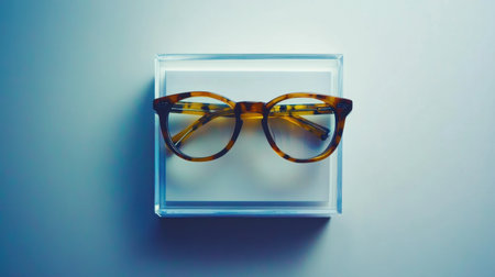 A pair of stylish tortoiseshell glasses elegantly placed in a clear acrylic box, highlighting modern design and minimalistic aesthetics. Perfect for fashion and eyewear enthusiasts.