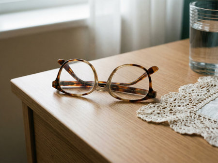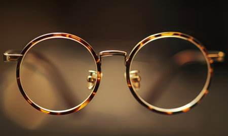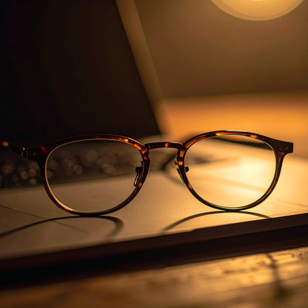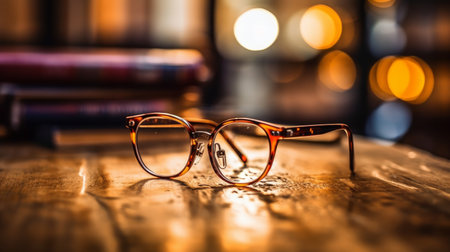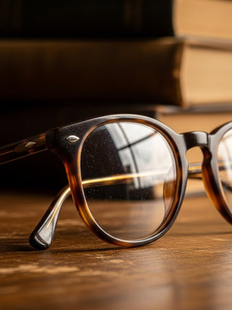 After a long evening of reading, a pair of classic tortoiseshell glasses rests on a surface, bathed in the warm, gentle glow of a desk lamp.