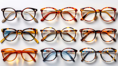 A diverse set of eyeglasses with various frame styles and colors neatly arranged against a white background.
