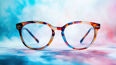 A pair of colorful eyeglasses is positioned gracefully on a soft, artistic background of vibrant colors and gentle blurs, showcasing modern style and creativity.