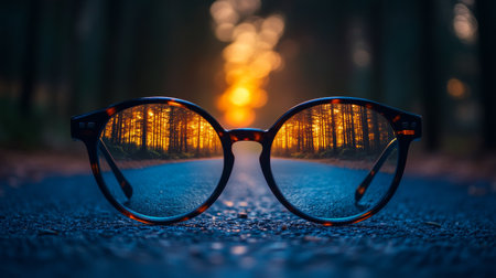 Glasses framing sunset over forest road