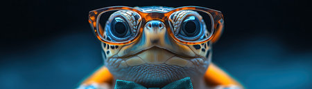 Closeup of a cute turtle wearing glasses and a bow tie, blue background, soft studio lighting