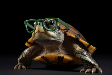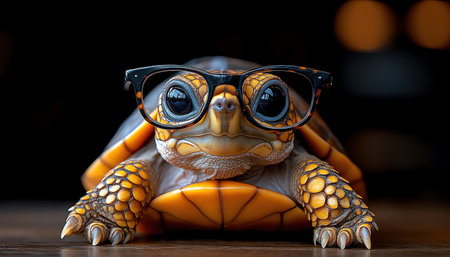 Whimsical image of a turtle donning oversized, trendy glasses against a dark backdrop
