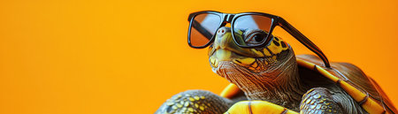 A confident turtle wearing stylish sunglasses poses on a contrasting orange background